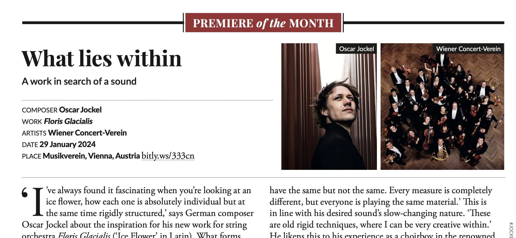 The work was presented to the public for the first time on September 19, 2024. Oscar Jockel had the great and unique privilege of performing the world premiere recording in the Vienna Hall of the Mozarteum from the harpsichord together with Leonhard Baumgartner, Margarita Pochebut (violins) and Svenja Dose (double bass).